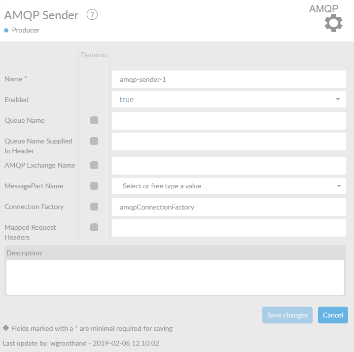 The AMQP sender is used to send a message to an AMQP destination. This destination can be a queue or topic in an AMQP environment. The connection factory decides which AMQP environment is used.