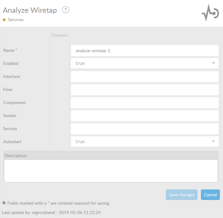 With this option you can decide whether the Wiretap should be on or off initially. If the Wiretap is turned off the Message is directly sent to the next component. By default this option is turned on (‘true’). |