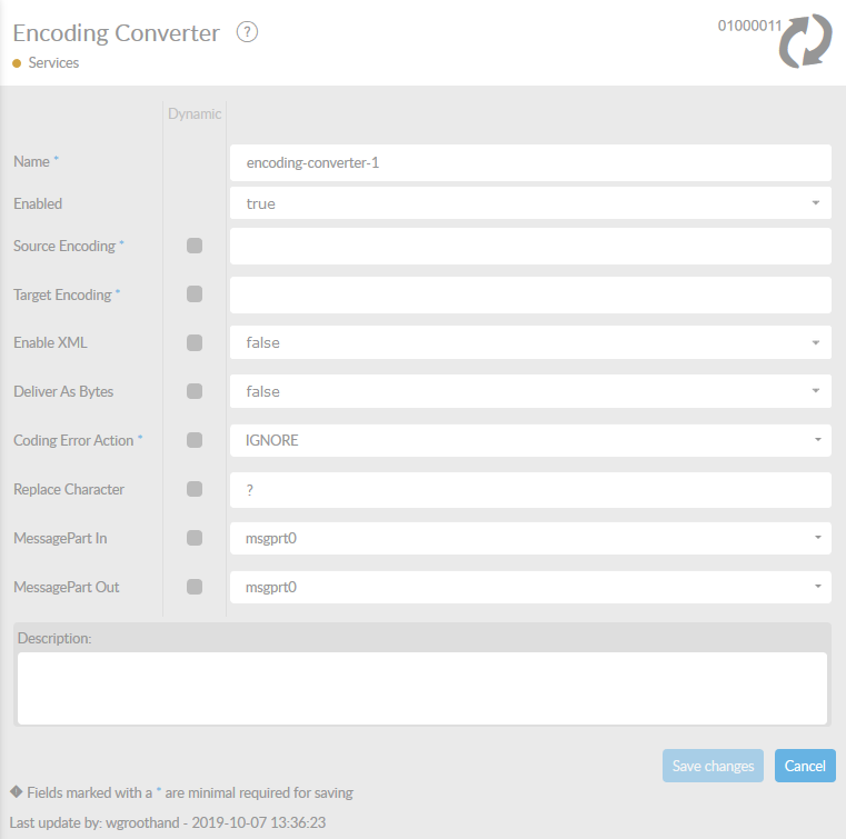 The Encoding converter is used to convert the encoding of the MessagePart-In into another encoding. The encoding from which you convert should be identified in Source Encoding and the encoding to which you convert should be identified in Target Encoding.