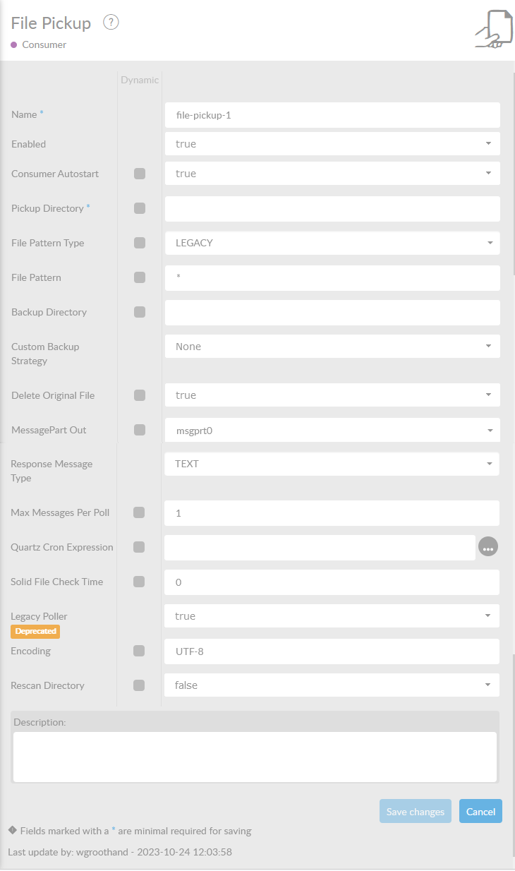 This consumer is used to read files into a flow. Files are read from the input directory. When a backup directory is defined, files can be copied to this location after they have been read. This consumer polls for files itself. Every single file with be a separate ConnectMessage entering the flow.