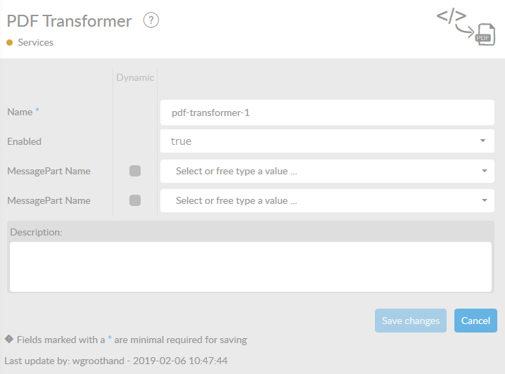 The PDF transformer converts the content of the MessagePart-In into a PDF file. This PDF file is then put on the MessagePart-Out.