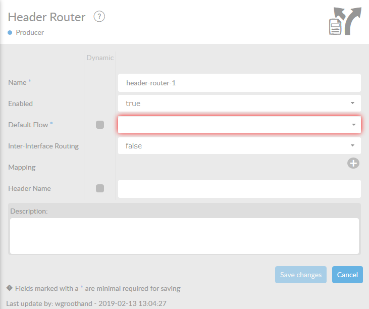 If no matching route can be found, the message will routed to this default flow. If you set inter-interface routing to true, you can select flows outside your current interface. If the field is 'red', there is a problem with the value of the field. |