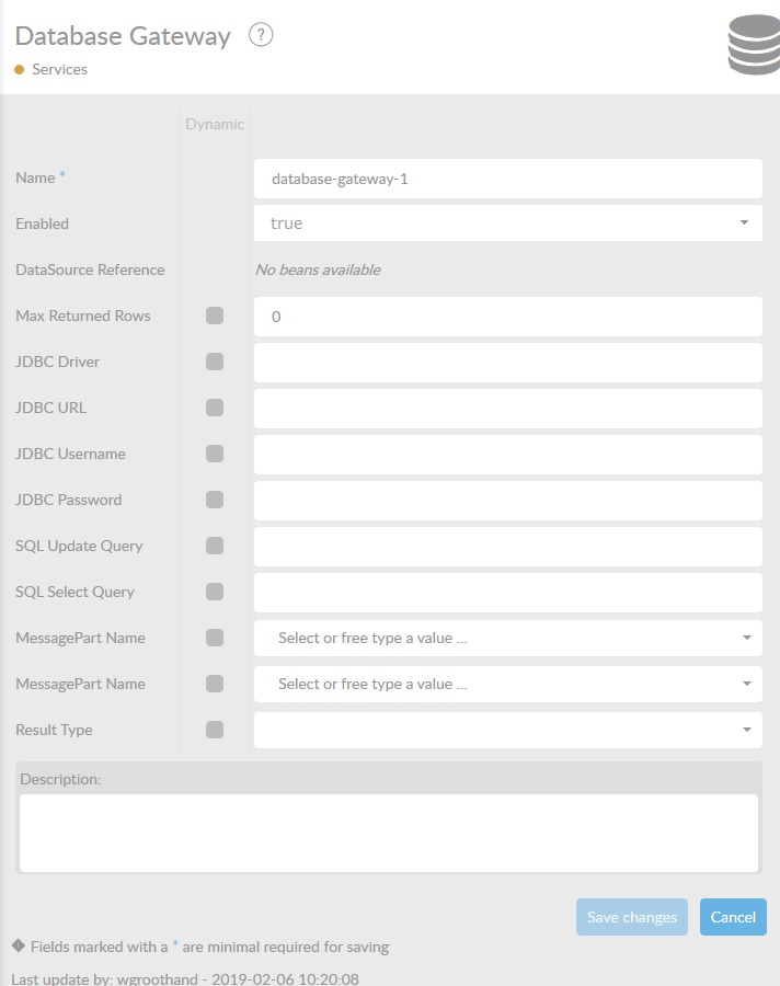 This service acts as a gateway to a JDBC database. The user can specify either a datasource reference (using a bean) or specify connection settings directly for the JDBC driver.