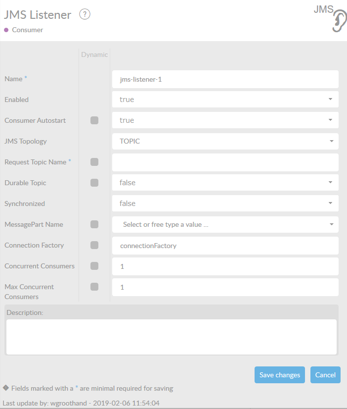 This listener is a message-driven listener. This means that the arrival of a message on the destination queue or topic, will activate the consumer. The listener’s output is a ConnectMessage.