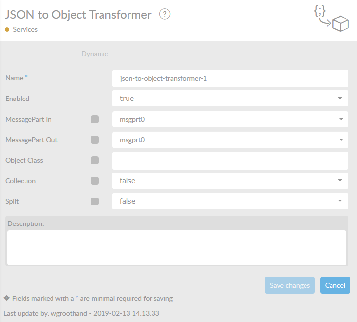 The JSON to Object Transformer transforms the provided JSON string to the object defined in the Object Class attribute. The result will be returned as an object instance.