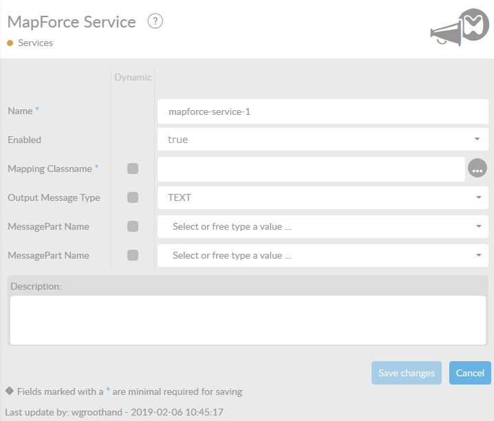 The MapForce Service is a service in which a MapForce generated mapping can be loaded. The result of the service is the result of applying the mapping on the configured MessagePart.