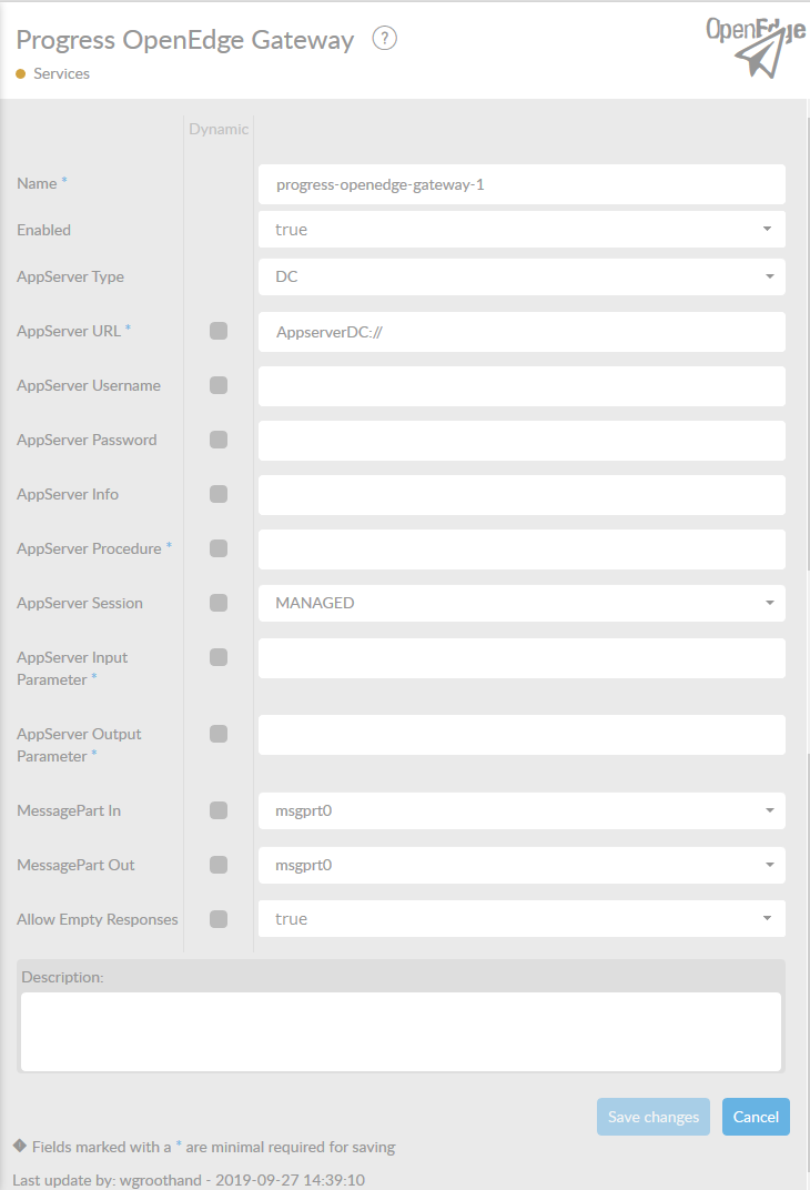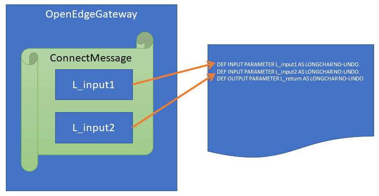 This service is used to call an OpenEdge procedure. The input parameter is filled with the text content of the MessagePart-In of the ConnectMessage. If there are more input parameters, you have to send a multipart message into the procedure. Use MessagePart-in with value 'ALL'.