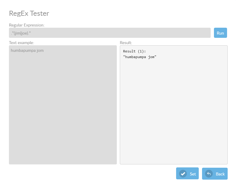 You can enter an RegEx expression and an Text example. When you press the button the expression will be performed on the given text file. The result will be returned in the result field.