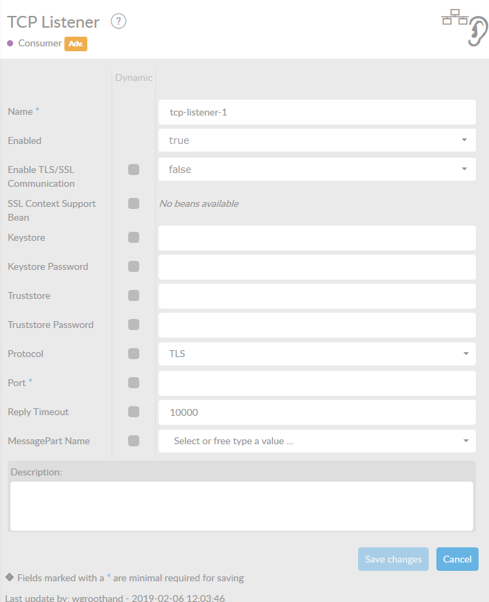 | Deserializer Bean Reference | Reference to a deserializer bean to be used for TCP consumer. This bean should be added in Constructor using the 'Beans' option in the menu. The reference bean must implement the Deserializer<byte[]> interface. The default deserializer is the ByteArrayCrlfSerializer. Normally the serializer and deserializer are the same bean. |
