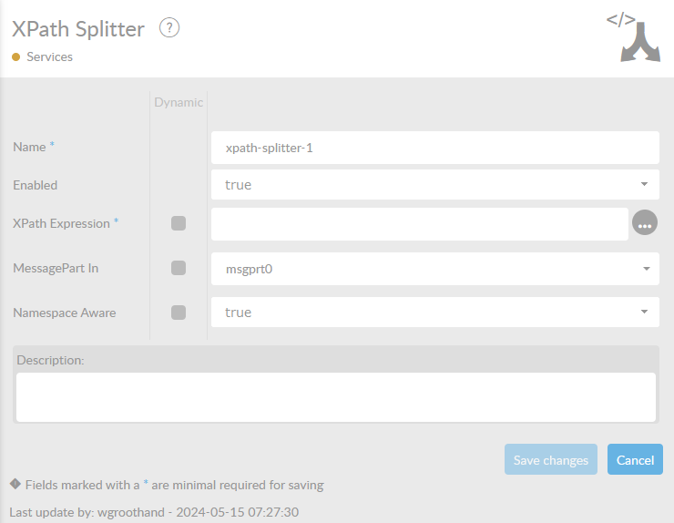 The XPath splitter is a service which can split XML input content into multiple parts based on an XPath definition. The results of the service are multiple output messages with the result of the XPath split on the configured MessagePart. The format of the input MessagePart has to be string or document. The format of the result MessagePart depends on the input format.