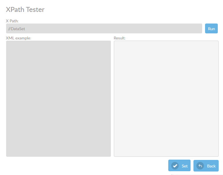 You can enter an XPATH expression and an XML example. When you press the button the expression will be performed on the given XMl File. The result will be returned in the result field.