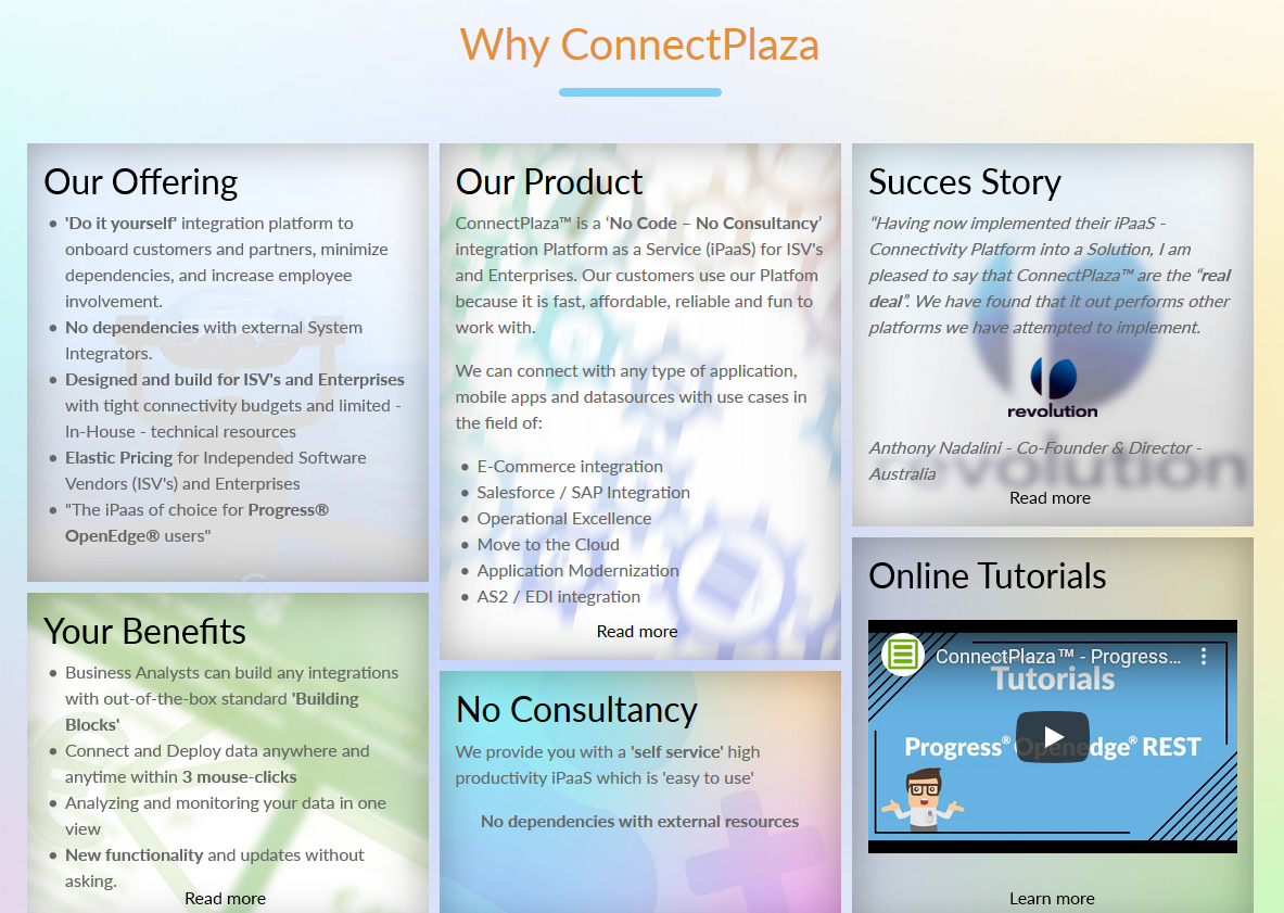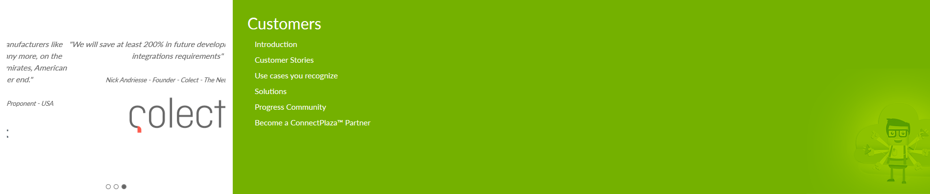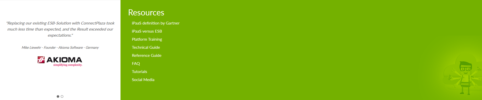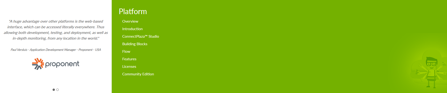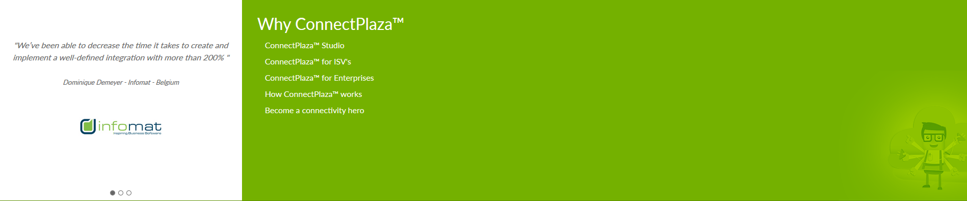 The upper part of the main home page introduces us to the ConnectPlaza Development Platform. You can access the main menu, get more information or you can get our product immediately, via the Get it now! button.