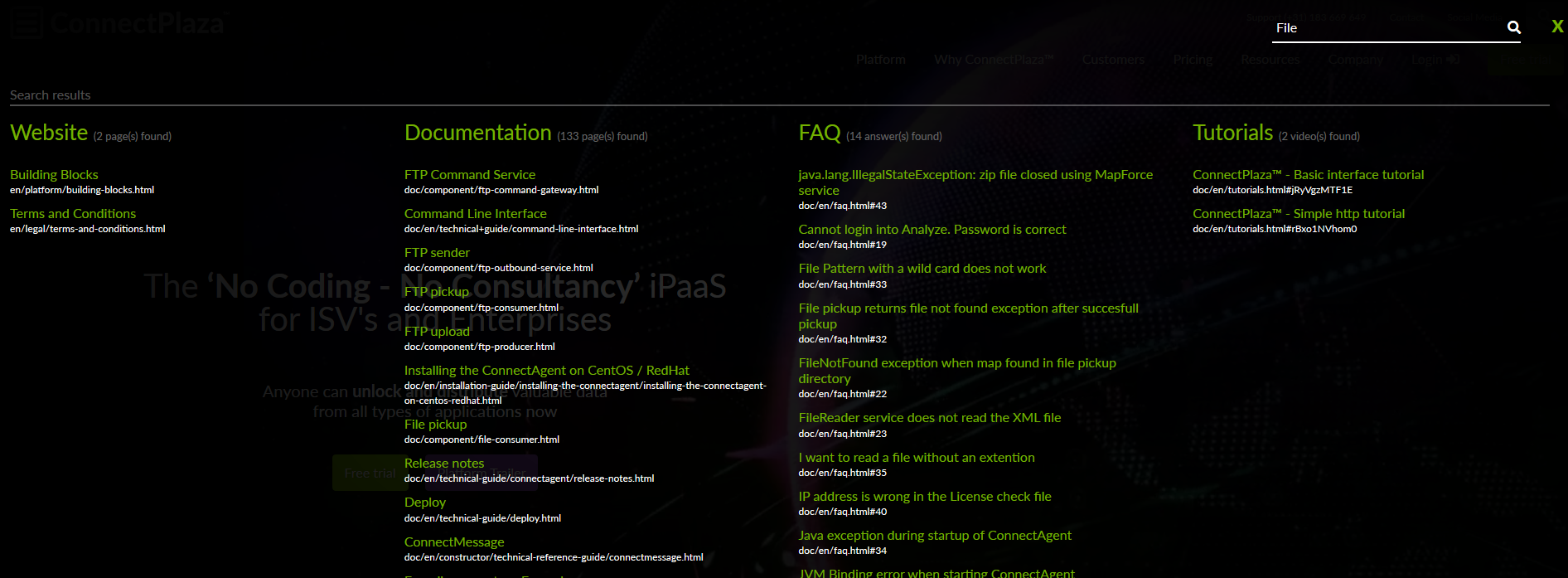 Click on one of the subjects to go to the specific page. Or if you want to leave the search engine, click on the at the top right of the screen, to return to the ConnectPlaza Website.