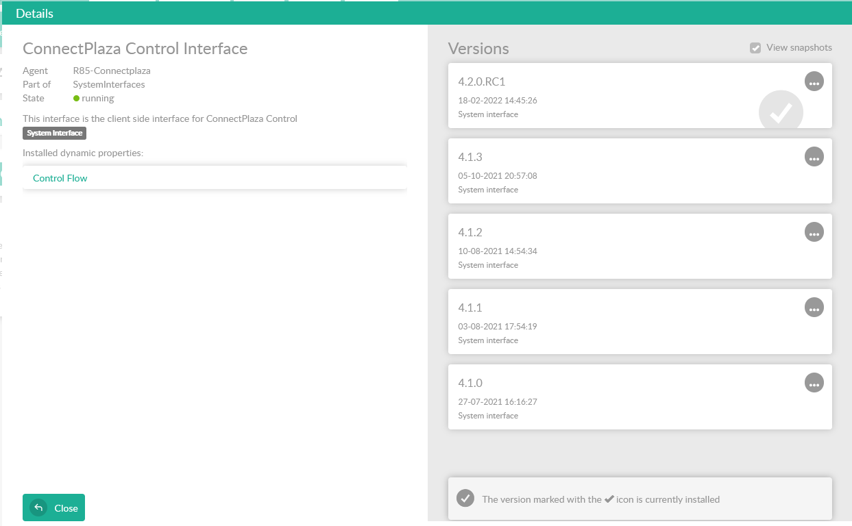 - Double click on the version you want to install, like in our example 4.2.0.RC1. There are no parameters for this interface. Just press Install to install the interface.