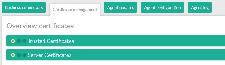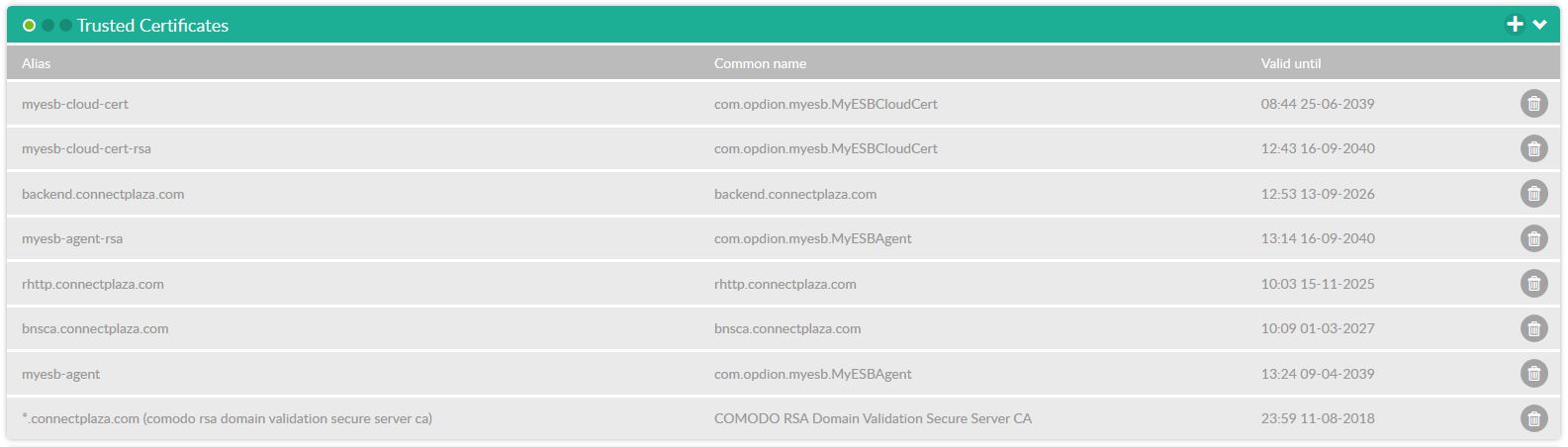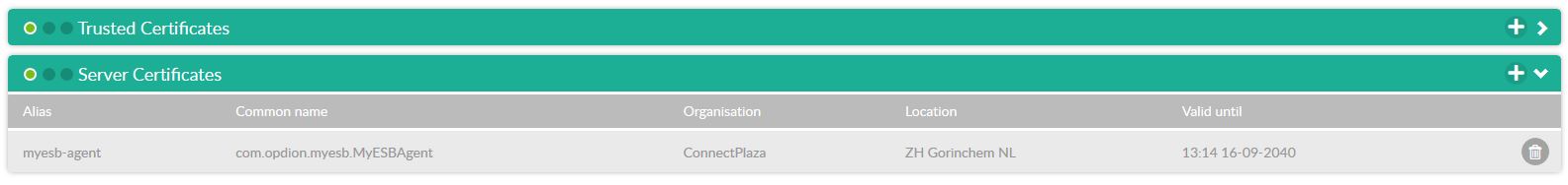 In the Trusted Certificates tab you can upload trusted certificates to or delete trusted certificates from the ConnectPlaza truststore. In the Server Certificates tab you can upload server certificates to or delete server certificates from the ConnectPlaza keystore.