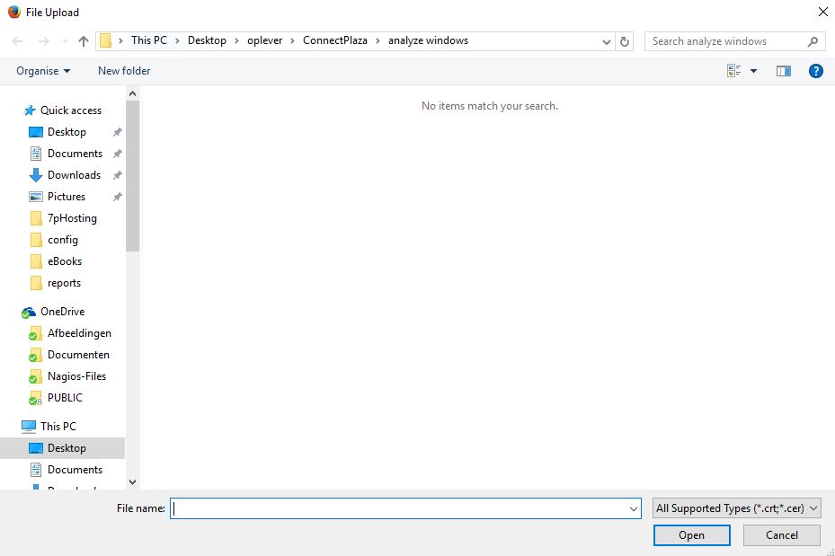 Drag your certificate to this screen or click in the middle of the screen to open a File Upload screen, like this: