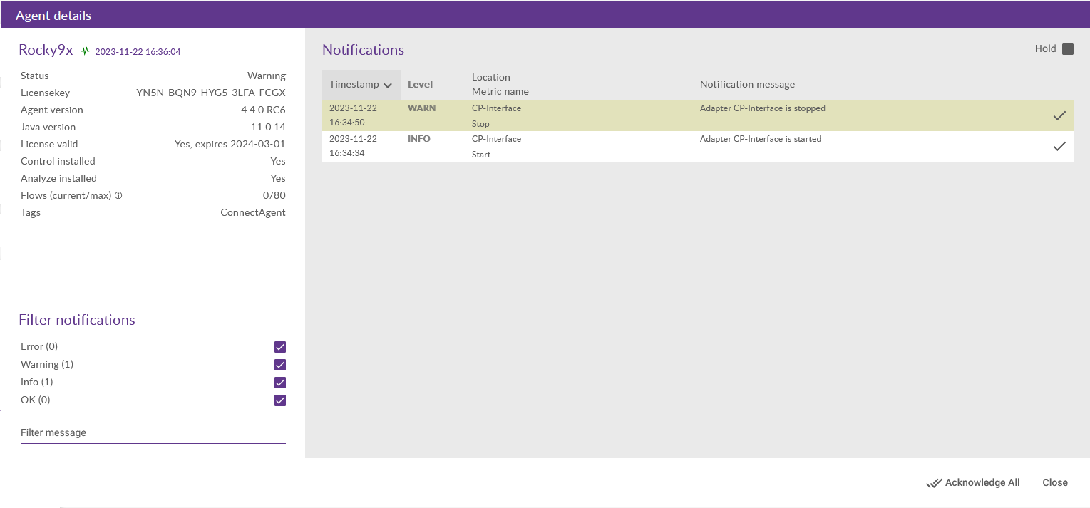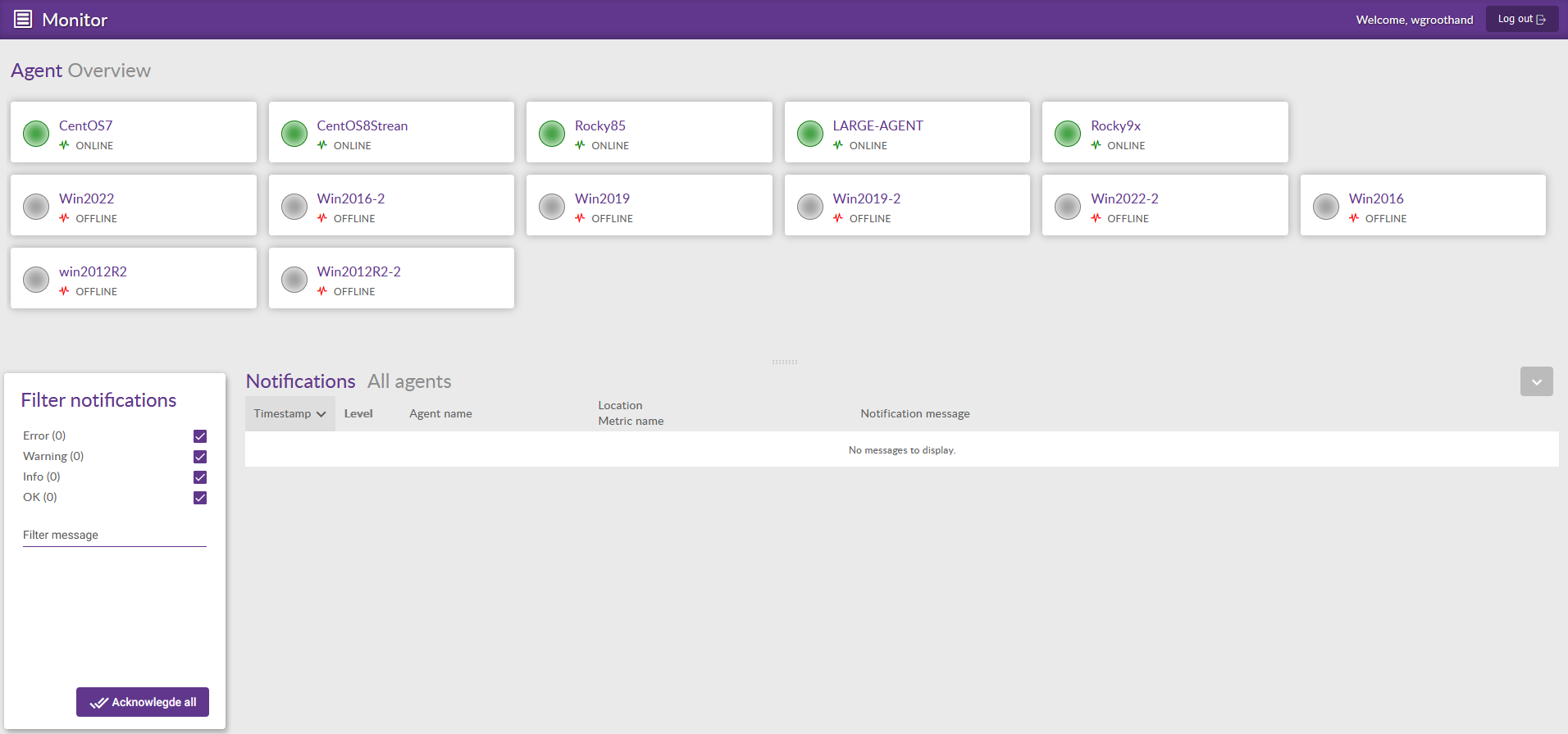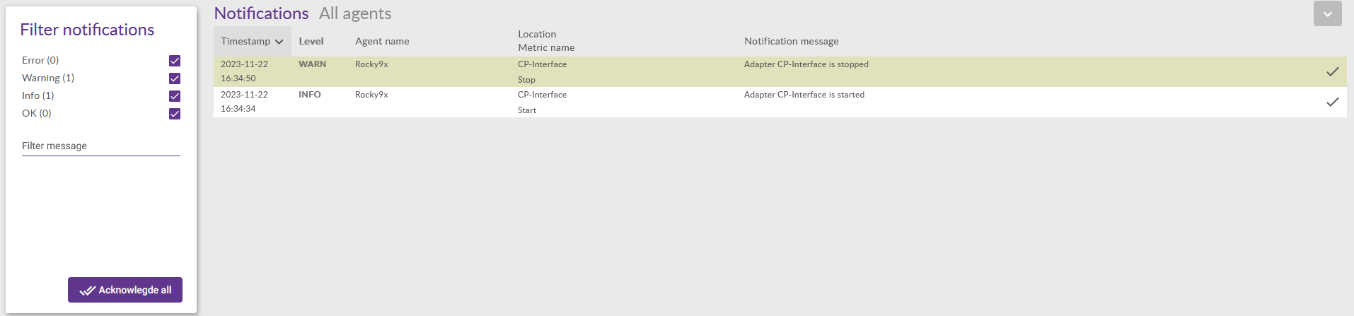 The lower half of this screen shows an overview of the notifications received by all of the above agents. These can be filtered by the Notification level and the message. This portion of the screen can be resized to the user's preferred size, even possibly covering the Agent Overview to see the notifications in full screen, or can also be collapsed to show the All agents overview in full screen.