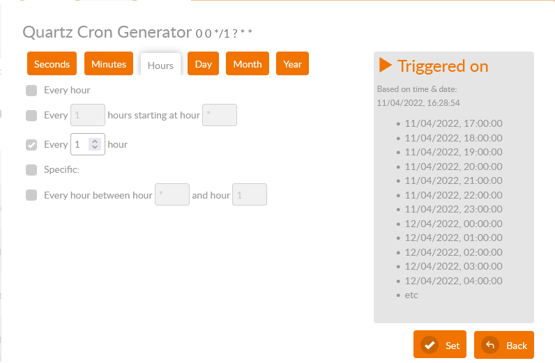 If you have selected the right interval, select the Set button to use the selected cron definition.
