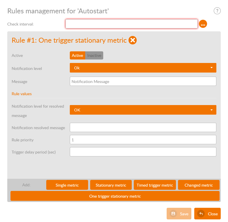 | Stationary metric | Test the value of the metric over time. If the value is not changed in the given time period, a notification will be send. |